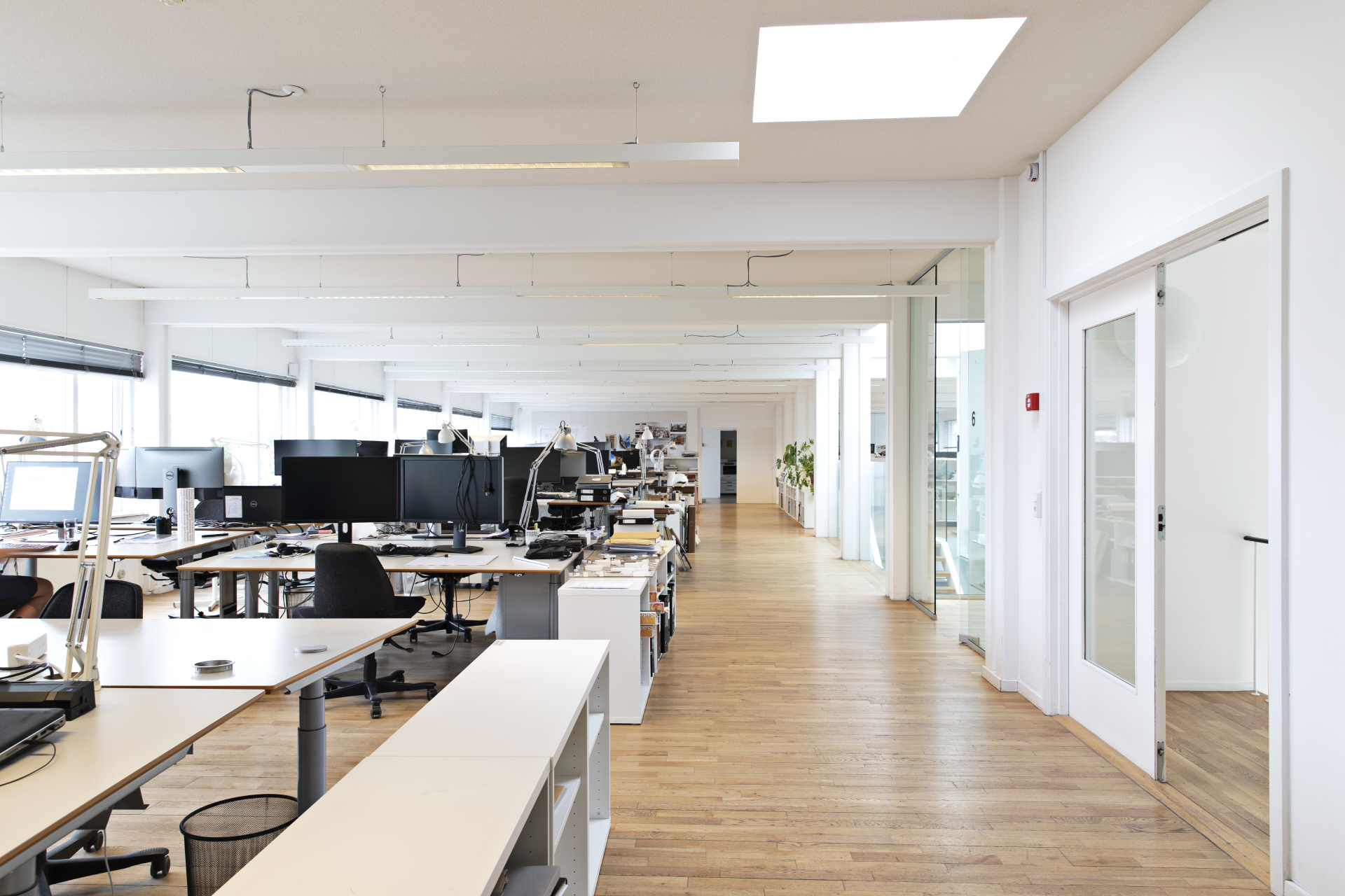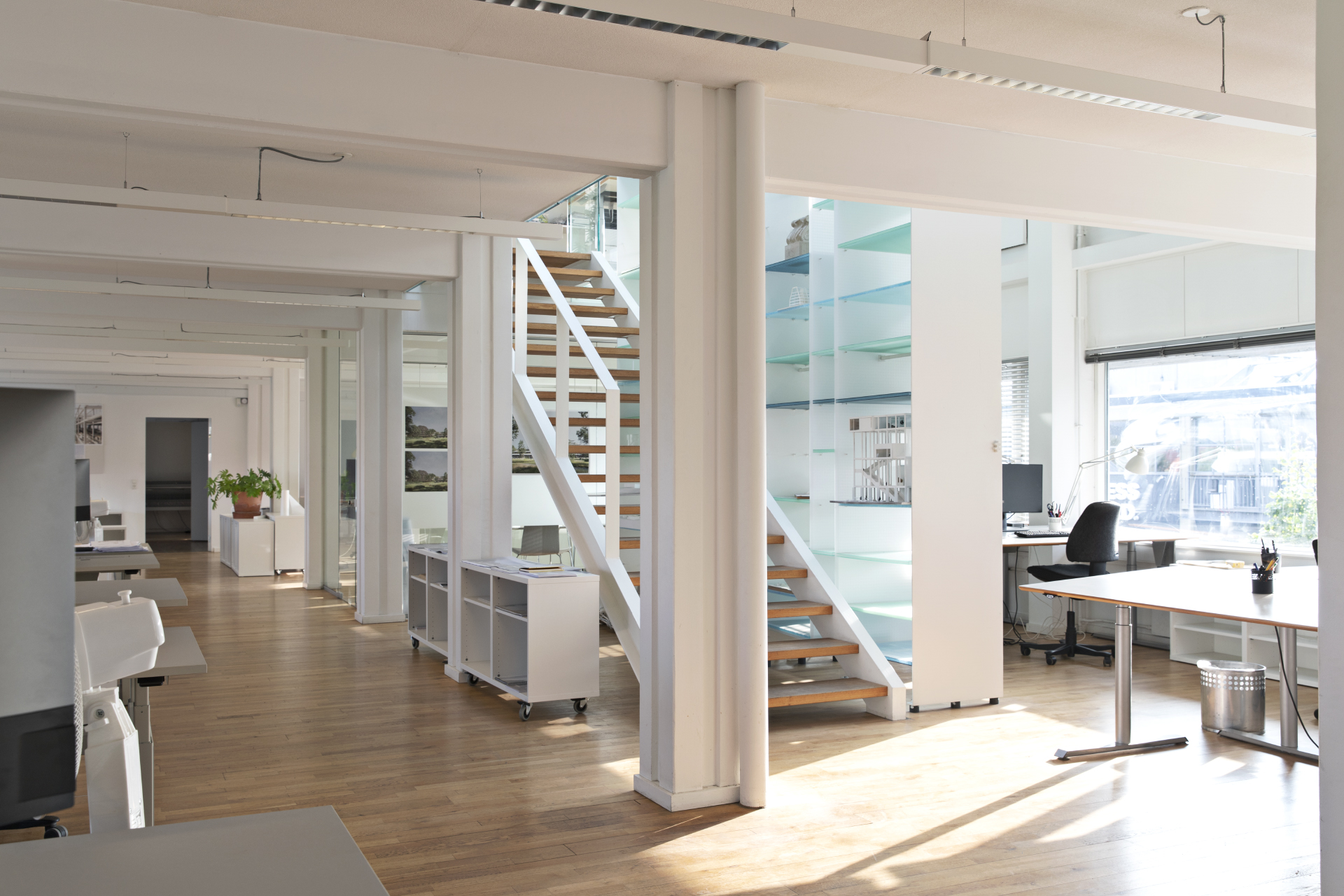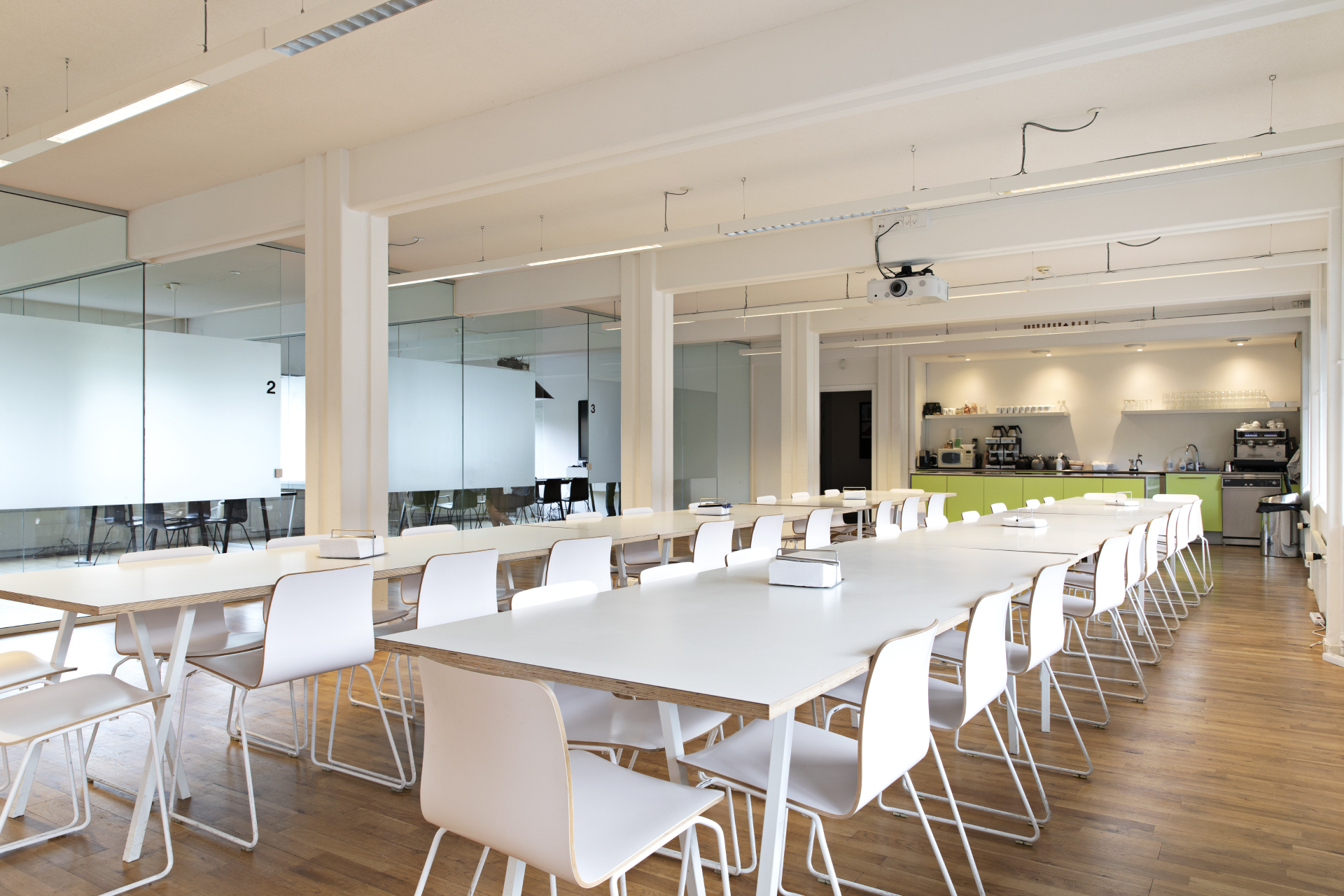 1. sal (398 m²) og 2. sal (402 m²) er indrettet med åbne kontormiljøer og aflukkede møderum. Her er udsigt til Kuglegården, Operaen og områdets skønne grønne områder.